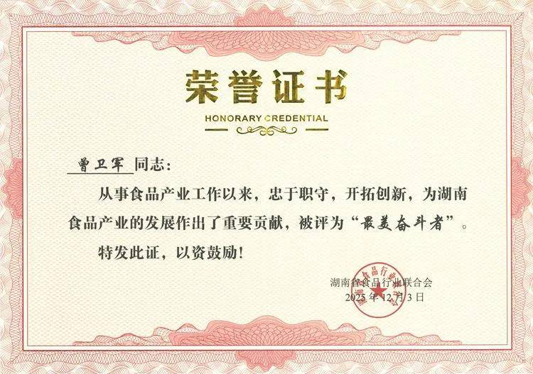 “此次荣誉是肯定更是责任”。曾卫军副总经理表示,集团将以此次表彰为契机,持续秉持开放创新思维与敢闯敢拼精神,深耕黑茶产业核心领域,不断强化品质管控与科研投入,以企业发展助力湖南食品产业高质量发展,为湖南食品工业发展贡献更多力量。
